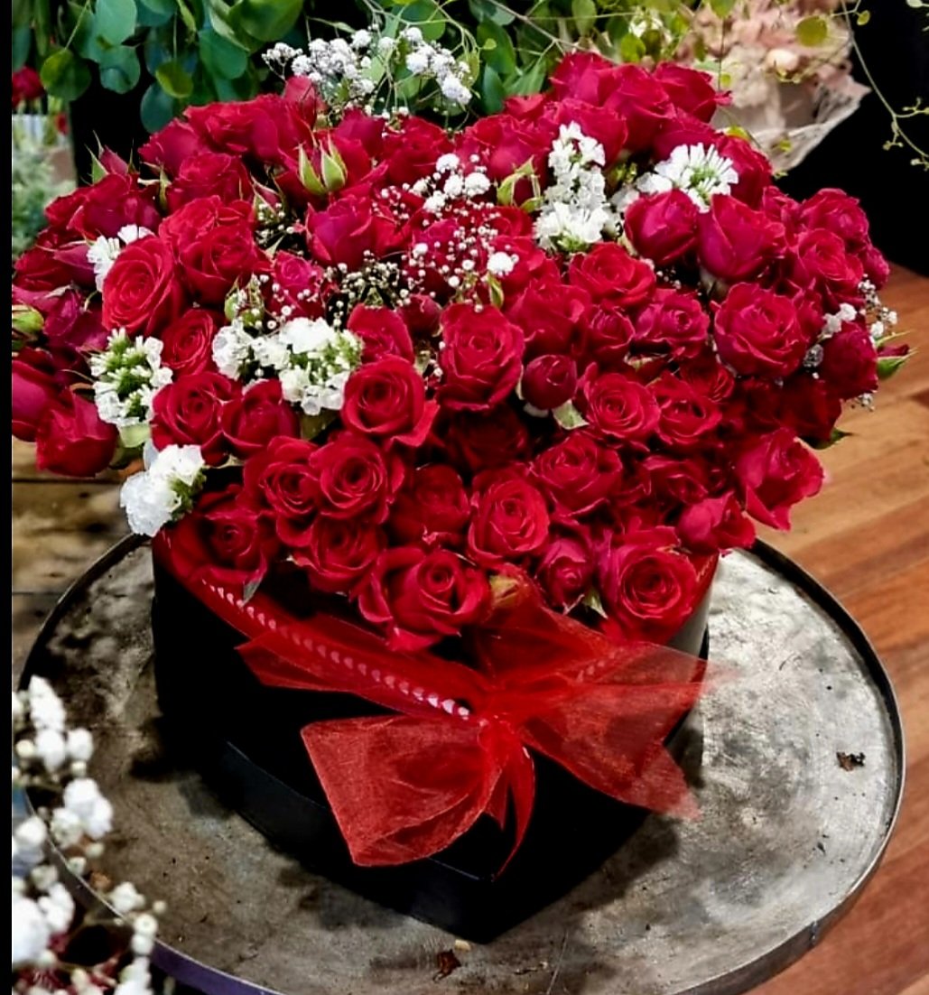 Boxed shape heart, filled with beautiful red columbian spray roses and baby’s breath