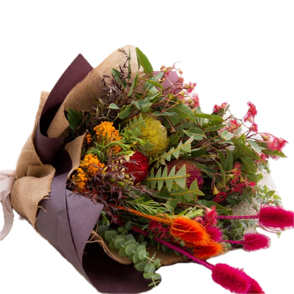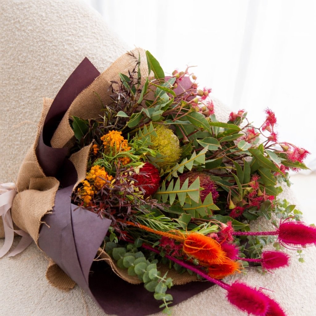bright and hardy Australian natives wrapped with ribbon.