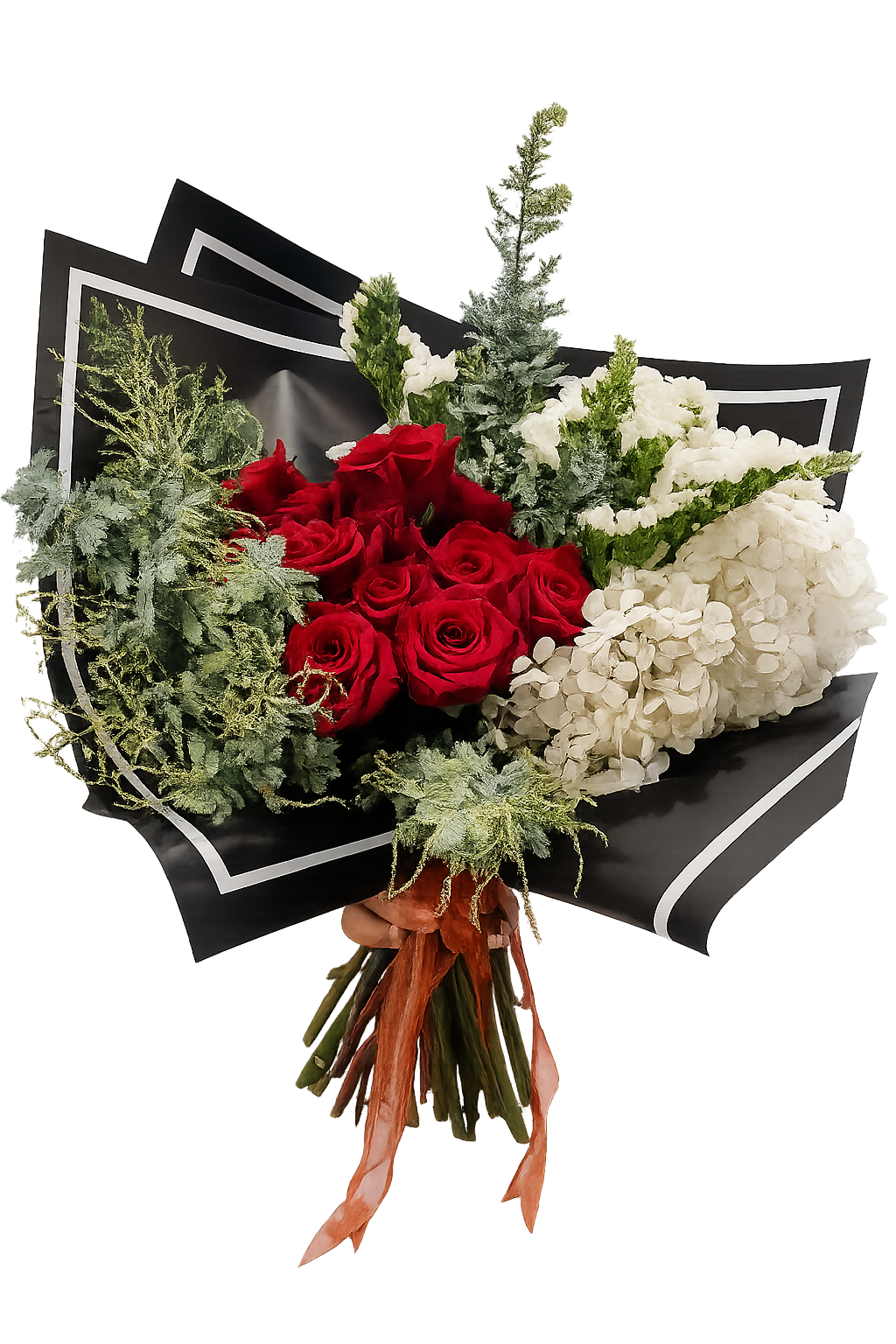 One dozen one bunch hydrandeas, wrapped up with beautiful fresh gum